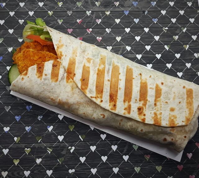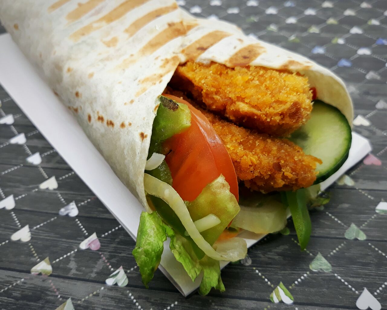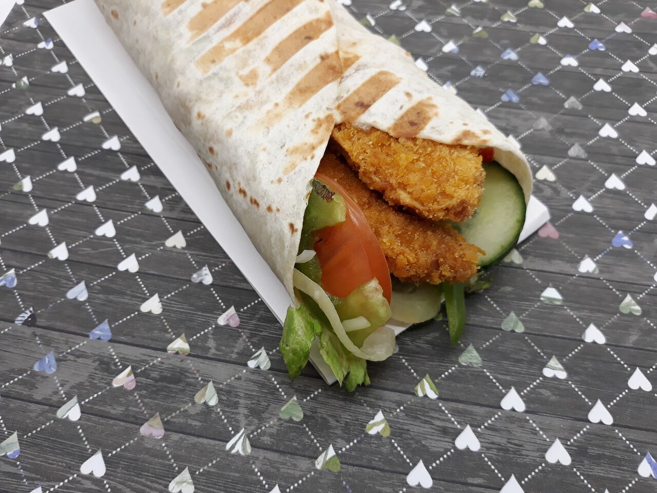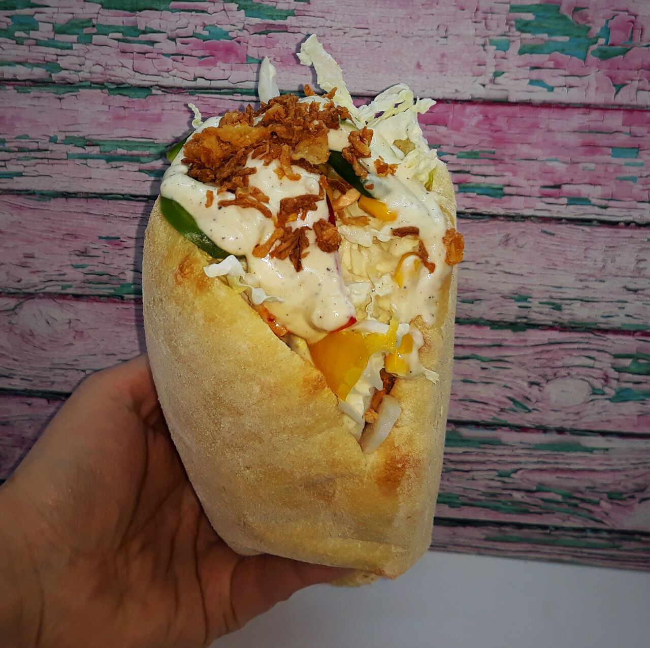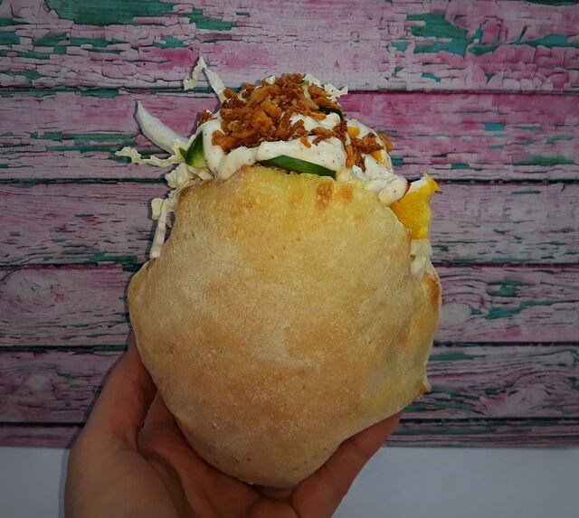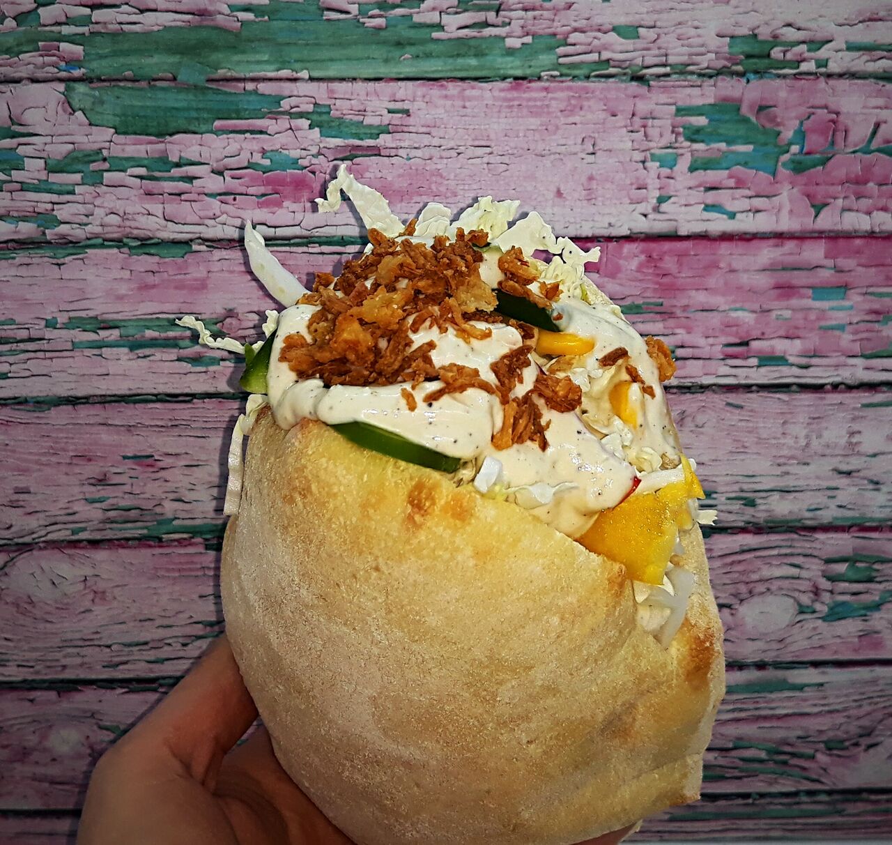 Gyros w wypiekanej bułce z pieca, pierś z kurczaka w aromatycznych przyprawach, kapusta pekińska oraz wyśmienity sos czosnkowy