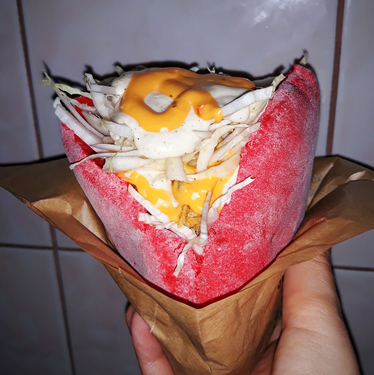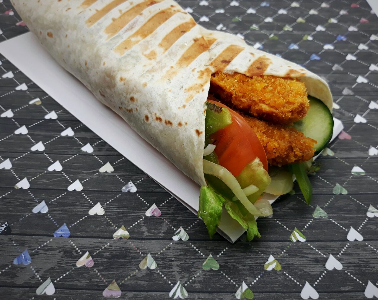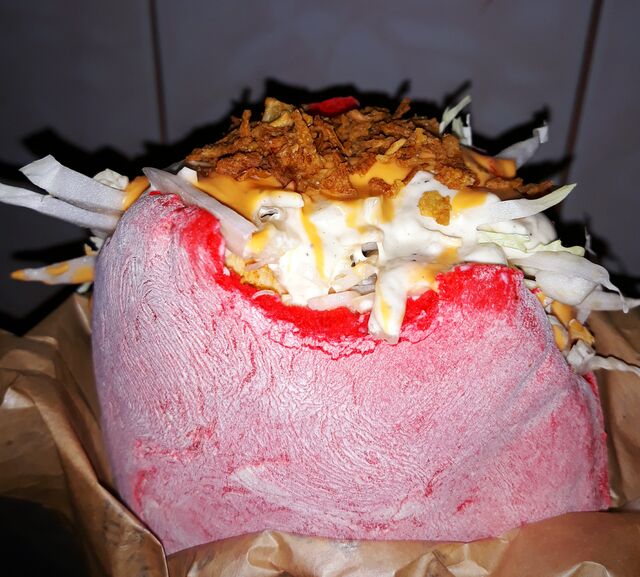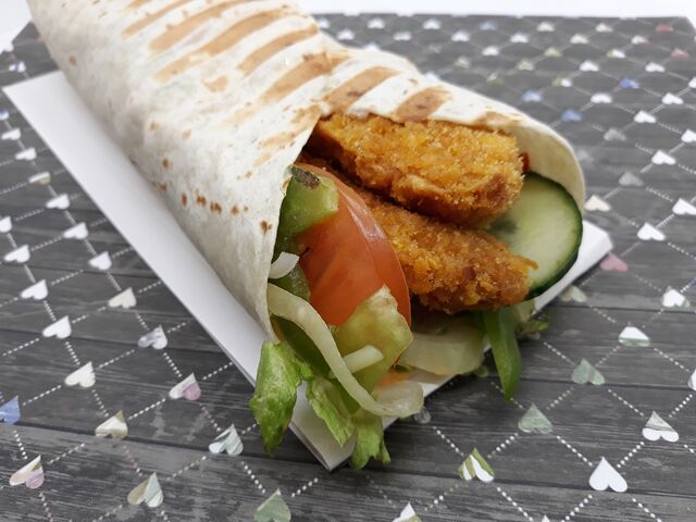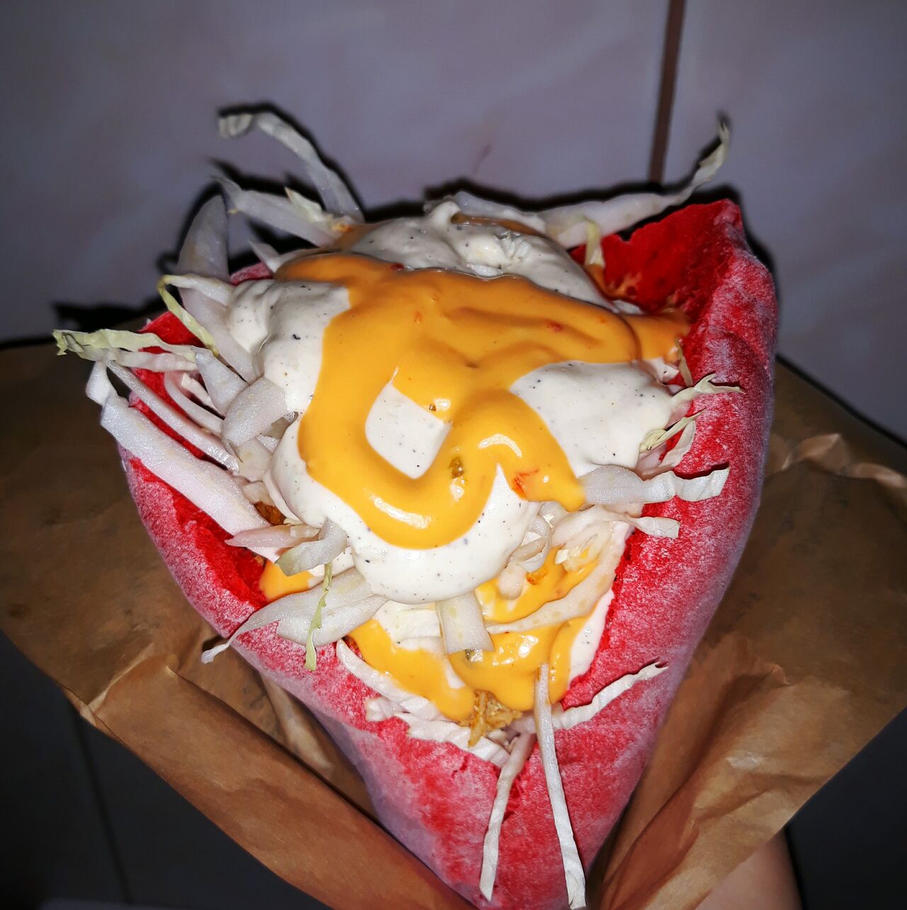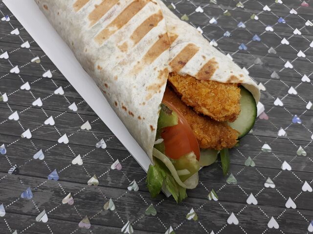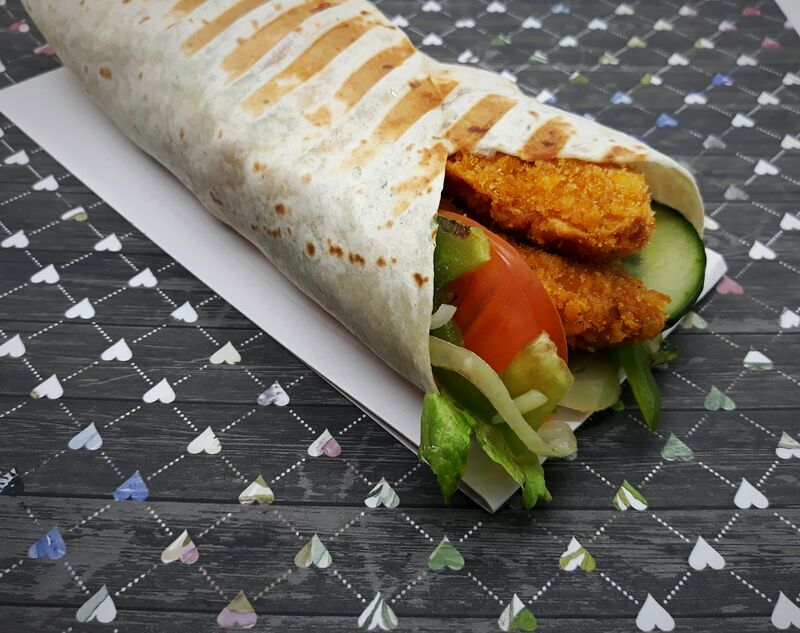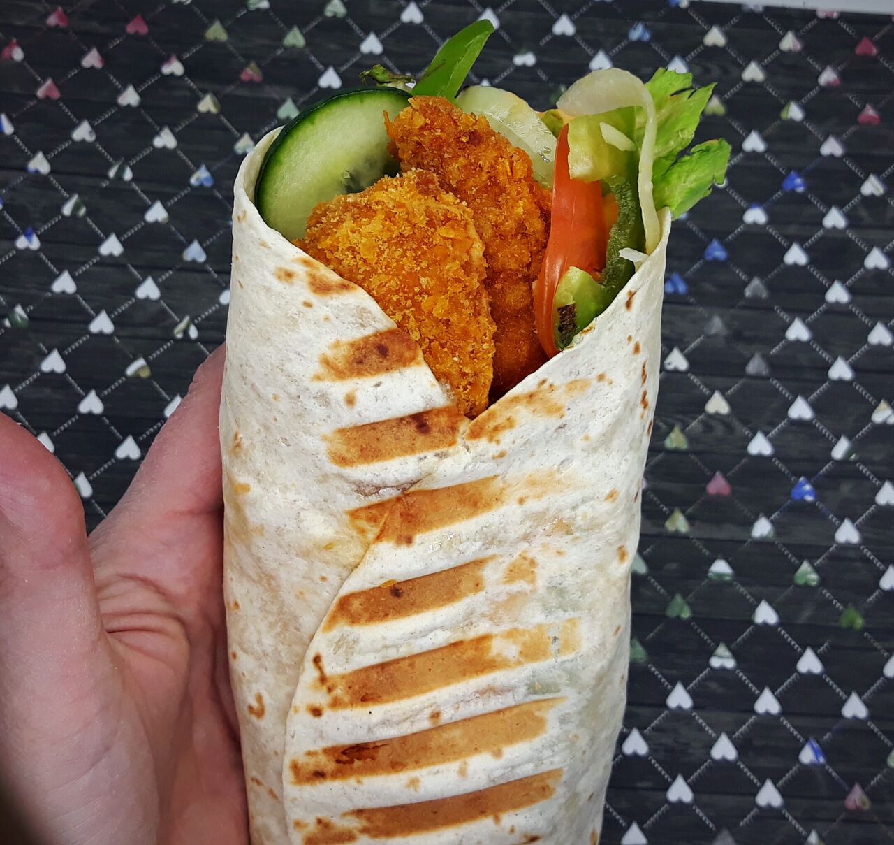 Gyros w wypiekanej bułce z pieca, pierś z kurczaka w aromatycznych przyprawach, kapusta pekińska oraz wyśmienity sos czosnkowy